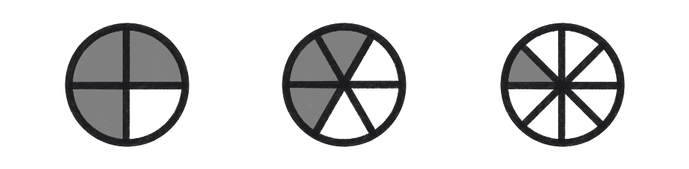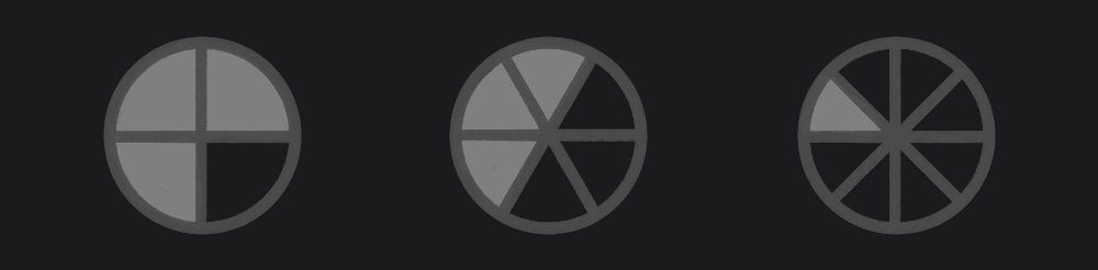 4 segment clock, 3/4 full. 6 segment clock, 1/2 full. 8 segment clock, 1/8 full.